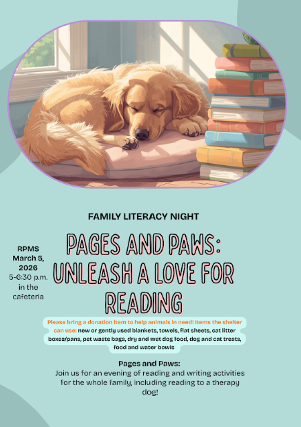 Please join us for Family Literacy Night - Pages And Paws: Unleash a Love For Reading from 5-6:30 pm tonight, March 5th in the RPMS cafeteria (see attached flyer).
